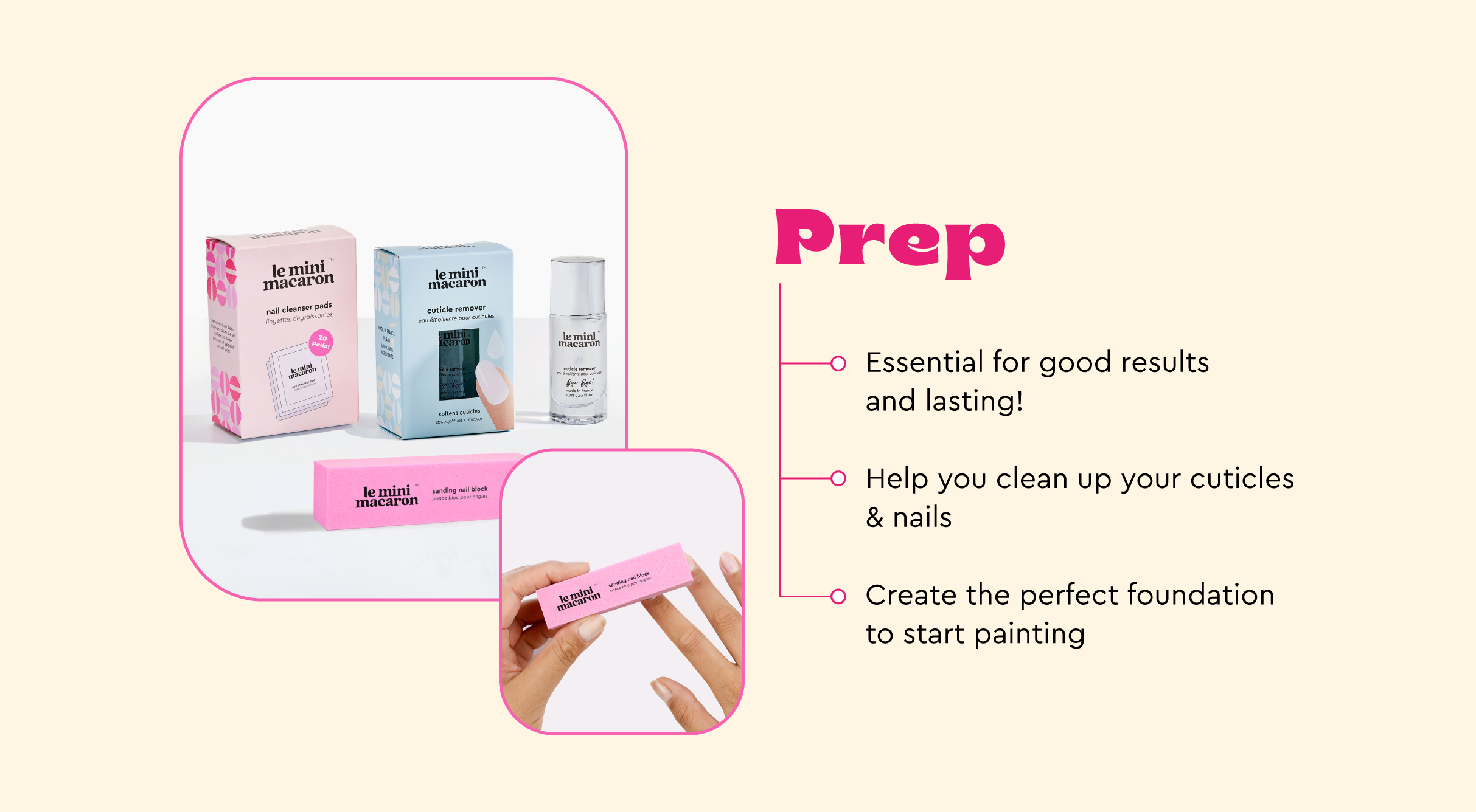 PREP: Correct nail prep before applying gel polish is essential for good results and lasting! Our prep tools help you clean up your cuticles & nails, creating the perfect foundation tostart painting.