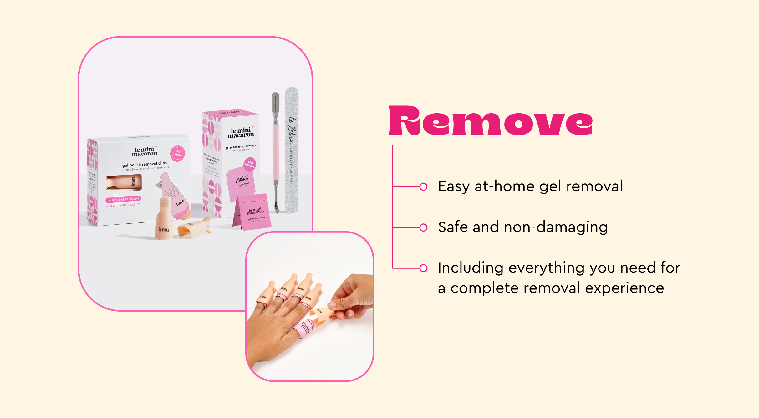 REMOVE: Gel removal at home is easy, safe and non-damaging with our LMM removal tools. We're including everything your need for a complete removal experience.